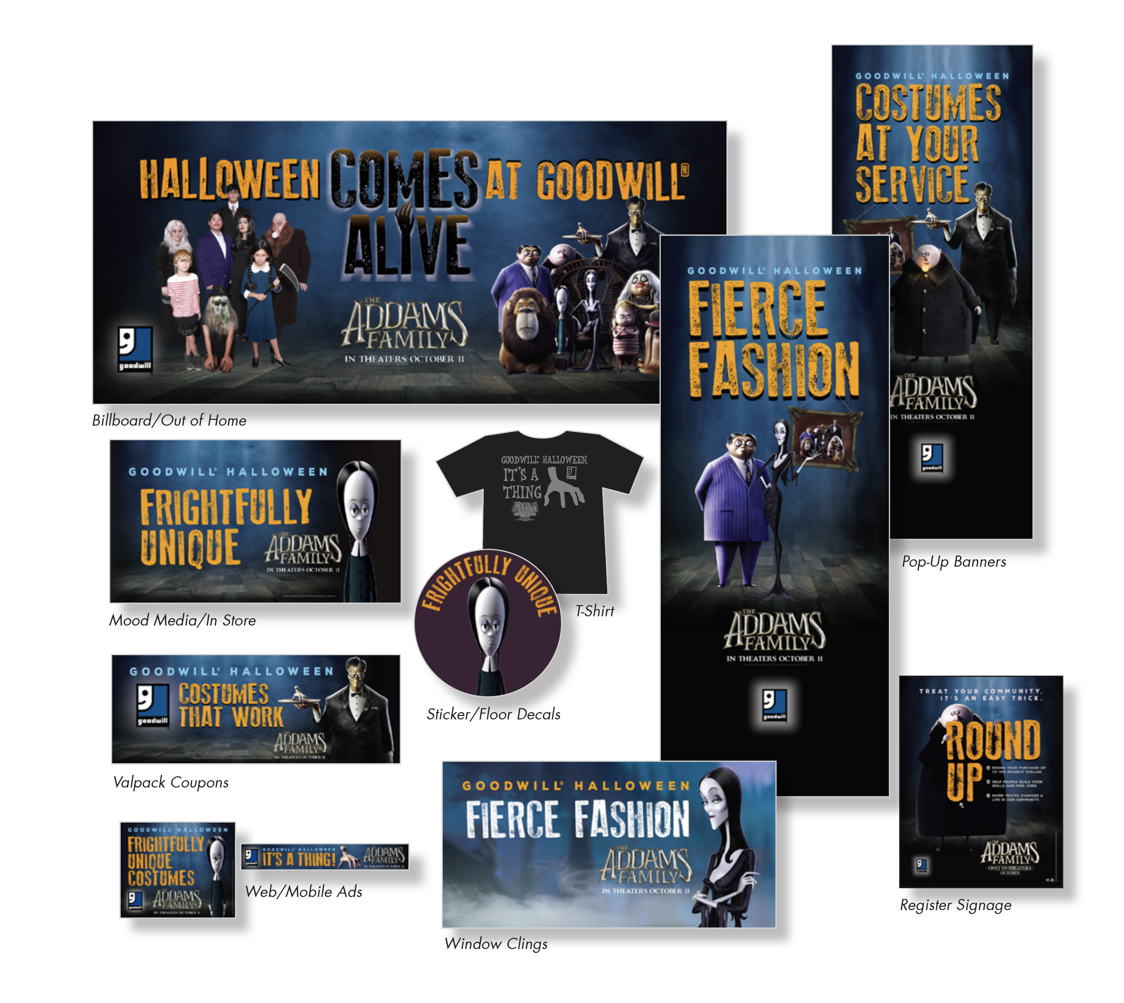 As Senior Creative for Goodwill Industries International and working closely with the Humane Society of the United States, I acted as photographer, costume designer, and Art Director for this project. We set up a one-day photoshoot at the HSUS offices, photographing dozens of pets, from guinea pigs to dogs, in various costumes and inserting them into our established Halloween creative templates. Working with animals in a studio photoshoot is literally herding cats.